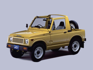 40年前に初めて自分で買った車は、ジムニーSJ30でした。ボディーカラーはこの写真と同じイエローです。幌仕様なのに、左右のドアはガラスも普通に手動で上下できて、フルメタルドアと呼ばれていました。今見ても斬新なデザインだと思うのですが、いとこには当時「なんか間抜けなデザイン(笑)」と言われた記憶があります。このフロントウインドウは実は前に倒してボンネットの上に固定できます(公道をその状態で走ると違反になります)。幌のつけ外しは完全手動なので、急な雨の時など、かなり大変でした。エンジンは2ストで、ガソリンに加えて2ストオイルも補給しなくてはならず、常に携行缶は手放せない、そういういろいろ手間がかかり、かわいい車でした。